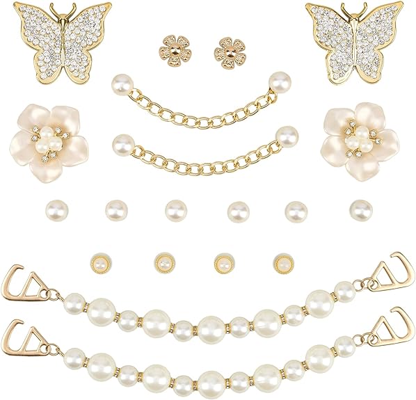 These pearl shoe charms feature a combination of pearls, flowers, butterflies, and the pearl chains.